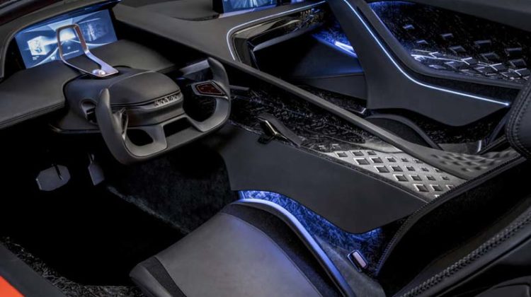 Karma SC1 Vision Concept previews the next-generation human communication interface modules including intelligent interior eye tracking, augmented reality-HUD, biometric identification / facial recognition and ultrasonic sensors for forthcoming autonomous driving features